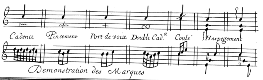 - Melody lines must be continuous and with a clear articulation between the phrases (mostly long articulation, imitating vocal style). For example, Guillaume-Gabriel Nivers in his book “Livre d'orgue: Contenant cent pieces de toss les tons de l’eglise” (1665) taught that singing brought to light the art of keyboard articulation, as the organ must imitate the voice; in 1680 Jean Le Gallois acclaimed Chambonnieres’s pieces and his performance for their singing quality; and Gaspard Le Roux suggested in the preface of his “Pieces de clavessin” (1705) that his harpsichord pieces could be learnt by first singing them.