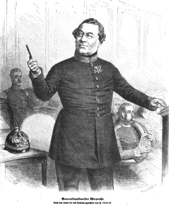 [ Wilhelm Wieprecht came from a very musical family, his grandfather, father and four cousins all being professional musicians. Born in 1802 followed a strict musical education given by his father. He studied trombone and held court position as trombonist in Dresden, Leipzig and finally Berlin. When in Berlin, the turning point of his life occurred, when he heard a Prussian military band perform the overture “Le Nozze di Figaro” by Mozart and decided to dedicate himself to military music. It could sound strange to read that a professional orchestra musician could be taken by an outdoor performance of a military band but we speak of a time when most orchestras were opera orchestras and the great repertoire orchestras had not yet emerged. Moreover, the military bands, due to the military, were more disciplined and performed at a higher technical level than these small opera orchestras. ]