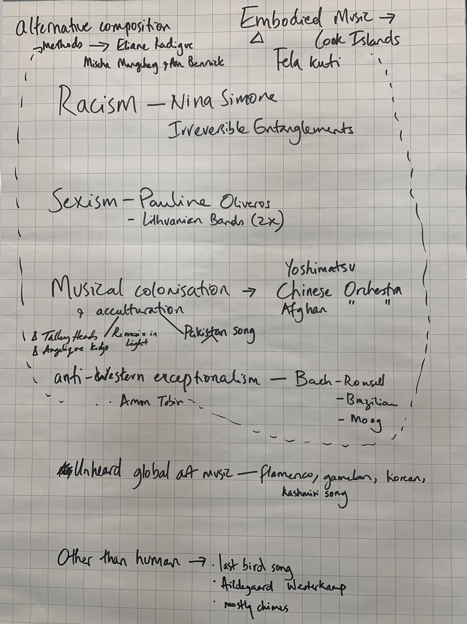 Together we read articles on decolonisation in relation to classical music from Sandeep Bhagwati, meLê yamomo and Margaret E. Walker. These articles enriched our thinking on the hegemony of Western art music in the discussion of art music. We asked if music could be ‘looted’ just as objects are and how we might ensure we are not acting in an extractive fashion. The practice of tokenism and the potential for instrumentalising marginalised groups was also raised. All the articles emphasised that the connection between the ‘colonial project’—that can be seen as ongoing—and the history of Western art music, is one that needs to be examined and exposed in any attempt at decolonisation. Some of the articles question whether we can decolonise and still retain what we currently consider valuable or whether we must rebuild the whole academy around alternate value systems.