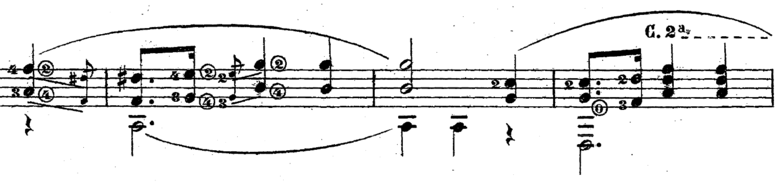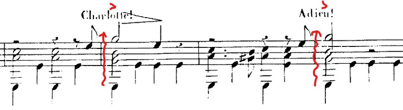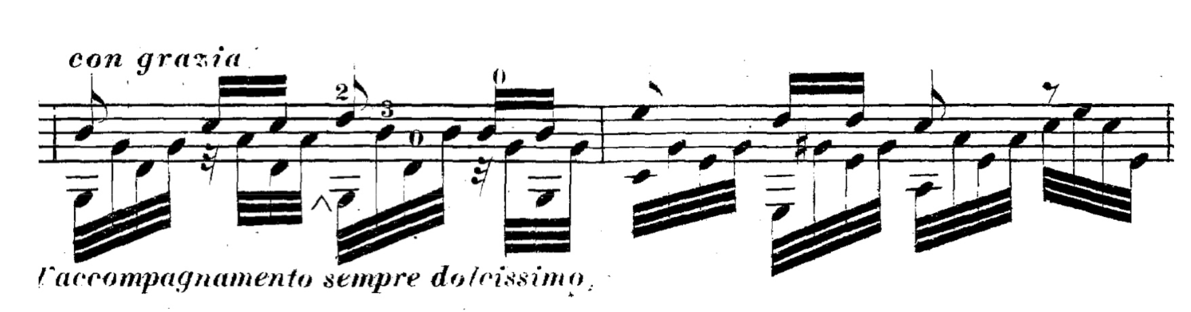 Another example from Chopin's Prelude op. 28 No. 7 (arranged by Francesco Tarregá). The effect of connecting the upbeat with the following downbeat in bar 1 is reached by placing the accompanying a slightly before the downbeat.