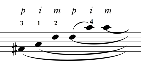 Another common device for arpeggiation on baroque guitar as well as theorbo is to pull backwards the index finger through multiple strings. Combined with the effect of imitating a reentrant tuning, the same arpeggio of the above sound example is as follows: