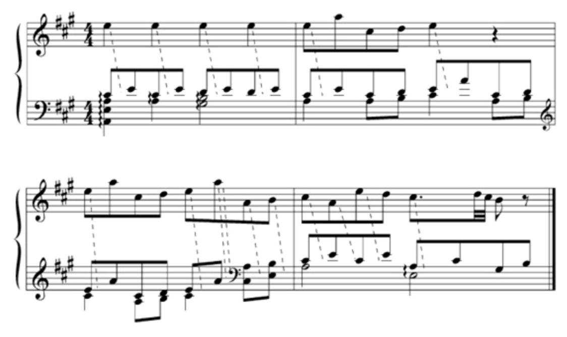 Neal Peres da Costa sees the playing of Reinecke as a combination of a "type 2" arpeggio and a dislocated melody note.