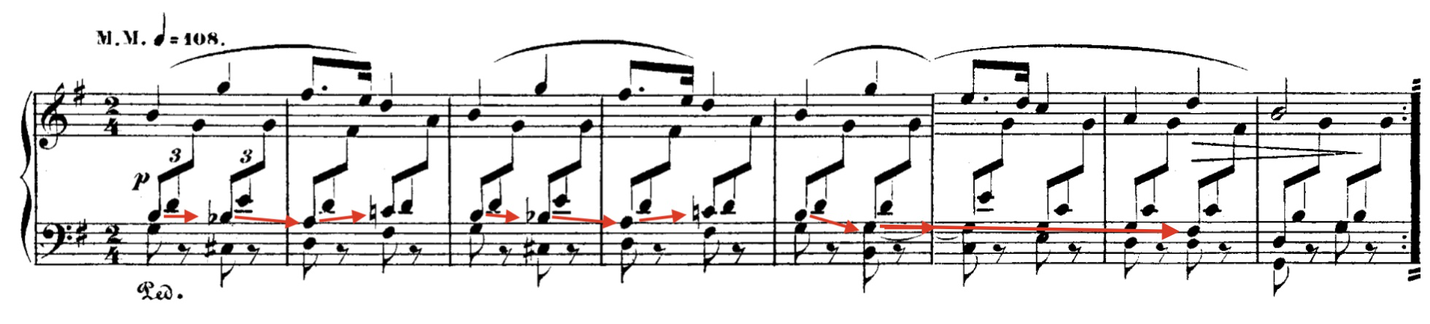 - Often the melody plays a small gesture surprisingly faster than expected – and the accompaniment comes in "too late" rather than the usual "too early"