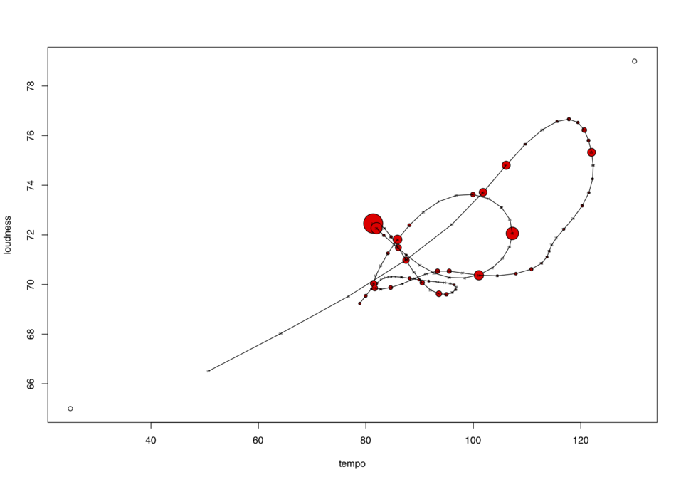 I have chosen to display arpeggi and dislocations on these "gestures" as red circles, growing by the length of an arpeggio.