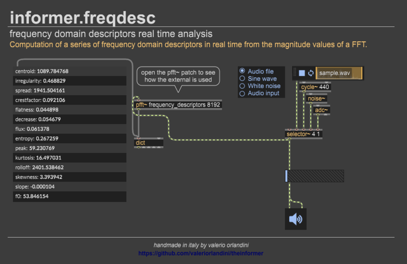 The descriptors also offer a sophisticated way of modulating effects and synthesizer parameters. For example, you could dynamically adjust a filter’s cutoff frequency in response to the spectral centroid of a concurrent sound, or modulate the noise level in a synthesizer to maintain a consistent level of spectral entropy.