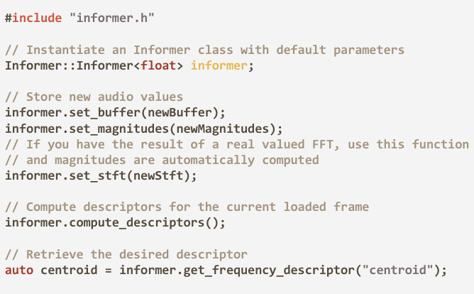 The descriptors also offer a sophisticated way of modulating effects and synthesizer parameters. For example, you could dynamically adjust a filter’s cutoff frequency in response to the spectral centroid of a concurrent sound, or modulate the noise level in a synthesizer to maintain a consistent level of spectral entropy.