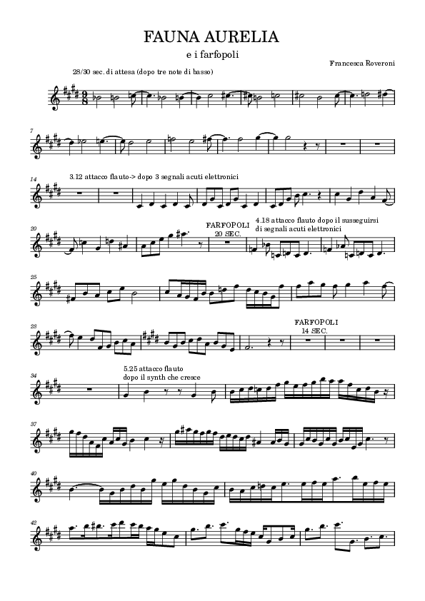 definiti nel flusso temporale accompagnano le note singole del flauto. I suonidigitali, generati da forme d’onda semplici in Max/MSP, vengono sintetizzati e