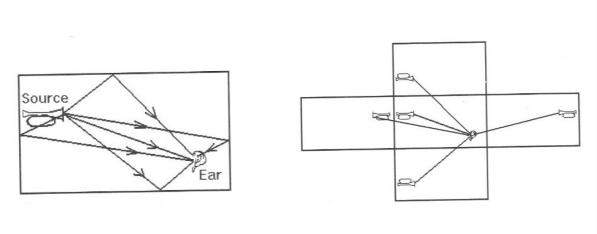 Cognitive misinterpretation of reverberation. Virtual sound sources are heard beyond the room. From (Shepard 1999: 28).