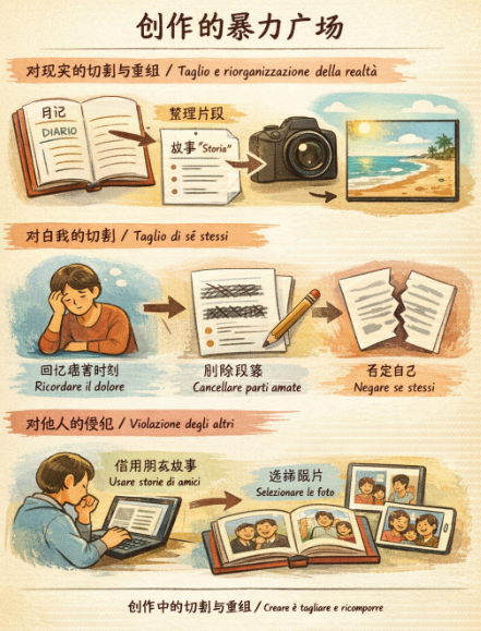 Quando scrivi un diario, comprimi le esperienze della giornata in poche righe e organizzi gli eventi confusi in un ordine narrativo. È un “taglio” della realtà, trasformandola in una versione raccontabile.