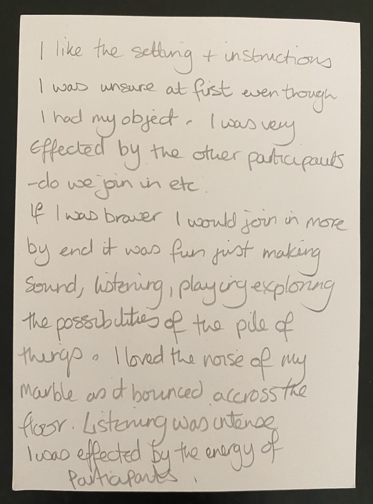 It would be tempting to situate this kind of engagement alongside works like John Zorn's Theatre of Musical Optics (1975-) which he described as "music without sound" asking “If you can make art with sound, can’t you make music with objects?” (Zorn, 2013), but unlike Zorn's piece which is concerned with the intrinsic optical musicality that objects have presented as sculptures or static situations, here we encounter objects whose affective qualities do something to the relationships between people, and between people and things.
