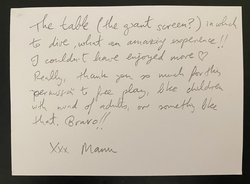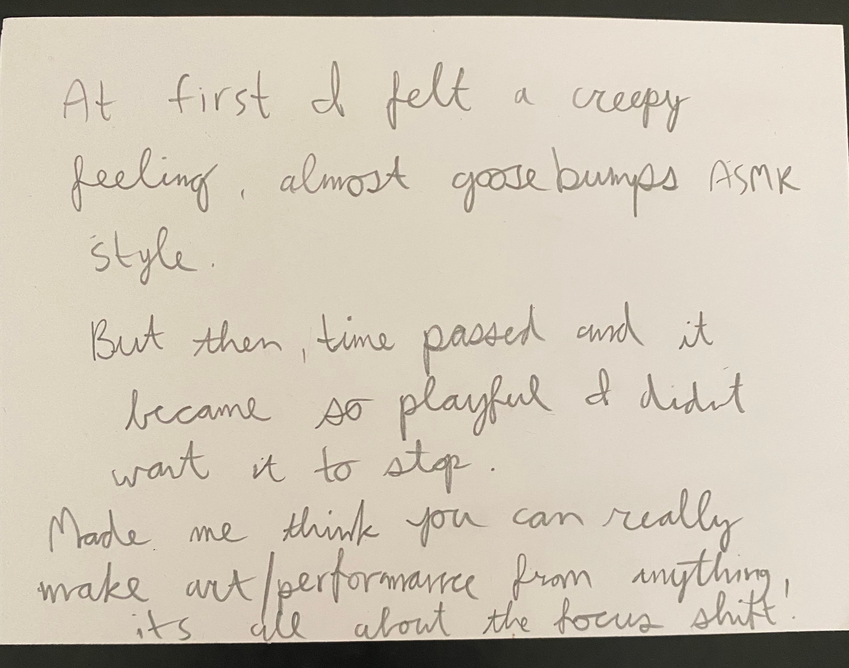 And it is specifically the affective qualities that differentiate what the objects do in this piece with other works such as Jodie Rottle's Your Sound Future (2018) in which the multi-sensory quality that objects have make their sonic powers more apparent. While in Ecstasies of Things, the objects' sonic potentials and their multi-sensory qualities do make them more appealing, their affective powers transcend their aesthetic sensuality, determining an encounter with the more-than that gets created with this type of physical engagement - a bodily immersion in the atmospheres they create.