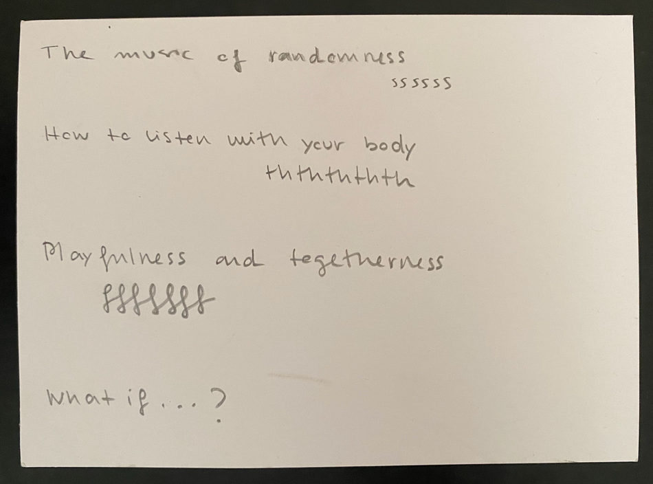 The emergent song functions as a probe into our felt togetherness and escapes out into the performance space we share with the four participants, transducing this feeling out into the open air. This vocal escape can be seen in itself as an ecstasy - as emanations from our own bodies that are affecting and changing the surrounding. Introducing ecstasies into the room by virtue of our voices primes the space, the modes of engagement and of listening, to be attuned to other potential emanations. We employ this kind of listening when we sit down and start touching the objects on the table. Our bodies as performers make this leap, forge this connection between voice and touch, between the atmosphere of song and the atmosphere determined by the encounter with objects and people in close proximity around a table.