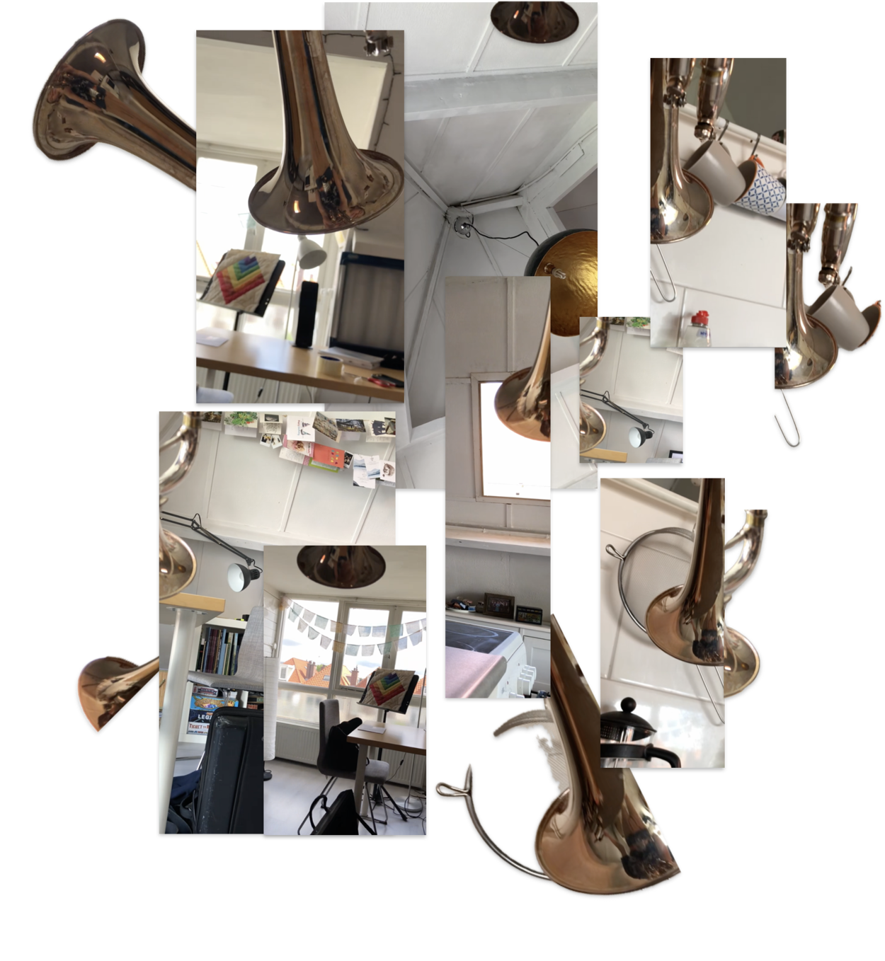 The practical solution came from Elisabeth strapping a phone to her chest as she drifted and lost focus through space while sounding. The video allowed to capture some of these minor elements - her physical setting, her personal items, decor but also her visual perspective and her body's movements, particularly the movements of the breath as she plays trumpet.
