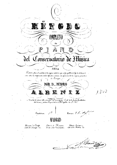 When Pedro Albéniz started thinking about writing a method, he had already been teaching for 30 years. Following Fétis` guidelines, he analyzed the most important methods and most remarkable production of the great fortepianists in Europe: Herz, Clementi, Cramer, Dussek, Adam, Hummel, Kalkbrenner, and Moscheles. Among all these names, Herz stands out; evidence of this in his method´s introduction. He puts together the last tendencies, updating the school of fingerings with clear influences from the pianism found in 19th-century France. It is occasionally compared to methods such as those from Czerny, Clementi, Hummel, Fetis-Moscheles and Adam. The truth is that the work does not play such an important role in the pedagogical literature of the instrument, but rather does so within the Spanish context. There, it was surely the most important method elaborated in the country to-date and it is probably the most significant of the century.