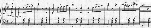 This last section is, in itself, multisectional and it usually begins with a variation of the theme. Within these pages, it is possible to find a considerable variety of pianistic designs and many ways of using them. An example of this can be the finale of the Variaciones brillantes sobre la Introducción of Norma by Bellini, op. 27.