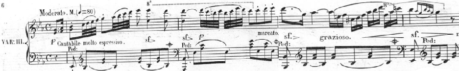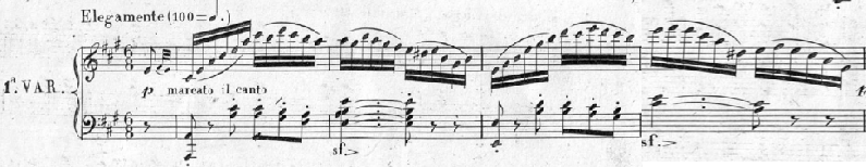 The first two variations are always written in the same tempo (or very close) although they present different characters. We can also find a slower variation, usually the third one (the fourth in the case of the Variaciones sobre el himno de Riego, op 28), which is also in minor mode).
