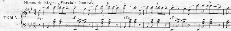 However, there is no doubt that the most elaborate of the finales found in his sets of variations in the finale of Variaciones brillantes sobre el himno de Riego, op. 28. Structured in several contrasting sections, some of them are built with thematic material. In fact, the last two of them are thought to accompany first a soloist's voice and then a whole choir who sings the Anthem one last time as a farewell.