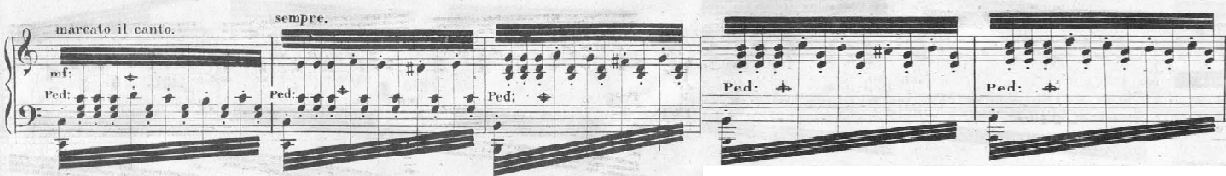 As we can see if we compare both excerpts from the last case, they are not written in the same key. After the analysis of his music, it is possible to affirm that this way of quoting the material taken from an opera is not very usual. They are much more commons the literal quotes: exact tonality and rhythm.
