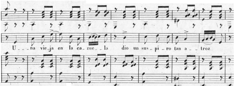 The collection of Danzas características españolas gathers four-handed pieces based on rhythm or motifs coming from folklore. Part of this set, are El chiste de Málaga, op. 37 [The joke of Málaga], La gracia de Córdoba, op. 38 [The Grace of Cordoba], La barquilla gaditana, op. 41 [The gaditian boat], La sal de Sevilla, op. 40 [The Salt of Seville] and El polo Nuevo, op. 41 [The new polo]. In these works, the author uses material from popular Spanish music: polos, fandangos, and seguidillas among others. The result is simple pieces which are not an attempt to be concert pieces but classroom ones. They are thought of an introduction to the elements of Spanish folklore. Some of them are built according to a rhythmical pattern identified with a specific dance, and other ones simply use melodic twists or harmonic relations which are clearly inspired in popular music. They are a reflection of the importance that the education already had to the elements belonging to Spanish music and culture at that time. The 1830s were precisely the origin of the nationalist ideology as part of the romantic spirit, and a lot of composers began to compose works of all kinds with inspiration in different elements of popular folklore and national culture.