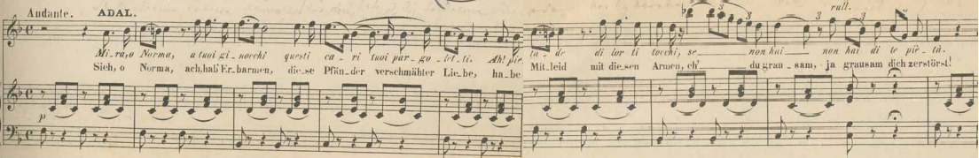 However, Albéniz´s use of the material is sometimes completely different. An example is the introduction of the Variaciones brillantes sobre la introducción from Norma by Bellini, op. 27. When in the ones based on the Himno de Riego he starts with an appropriate “Tempo di Marcia” and writing that remembers the instrumentation of a band, here the composer writes “Larguetto” and the writing shows that his inspiration in the Opera is further than just the title. Passages like the cantabile of bar 15, shows the influence of Italian Bel-canto applied to his pianism.