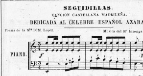 Part of Pedro Albéniz´s artistic activity also finds its inspiration in the Spanish folklore, especially appreciable in his Danzas características españolas and the Rondó Brillante a la Tirana sobre los temas del Trípili y la Cachucha, op. 22. Some of the elements he takes from the popular Spanish culture were used before but they are treated in a completely different way. Examples of this are the seguidilla or the fandango, already employed by the Escuela bolera[16] from the 18th century. Other elements that he uses have no background in Spanish piano literature. An example is, the use of zortzico, belonging to the Basque folklore, which Albéniz felt very close to after living thirty-five years in the Basque Country. It was precisely his connection with this region that impelled him to elaborate, together with Juan Inzenga, a popular Basque songbook.