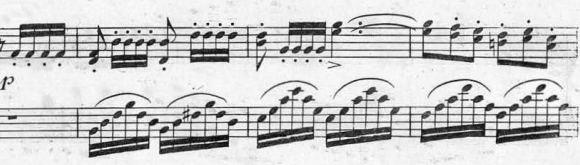 The Larguetto maestoso in F major is a clear transcription of the orchestral tutti that accompanies this quartet in the Opera. Very few variations are done and all of them within the corresponding harmony (e. i. b. 101-108 and b. 118-124). The section can be divided into two thematic materials which are repeated, as always, through the variation. The sixteen notes triplets lead us to a four-bar codetta of the section.