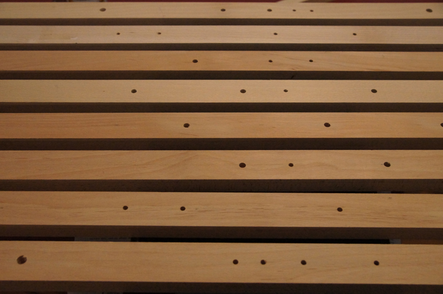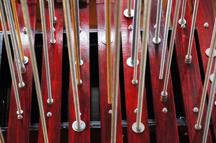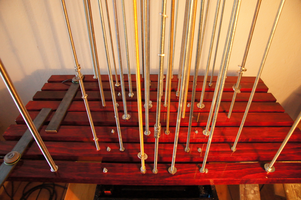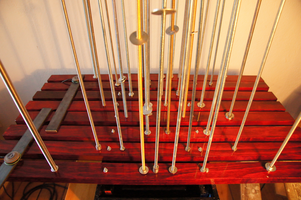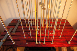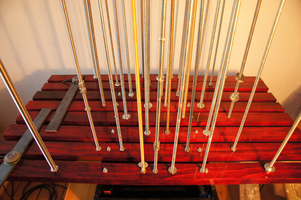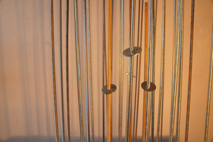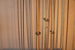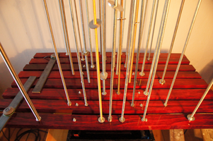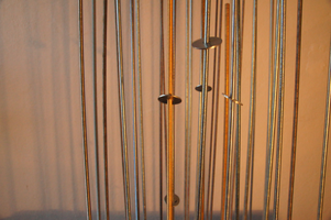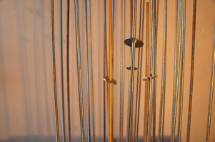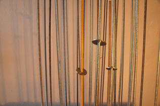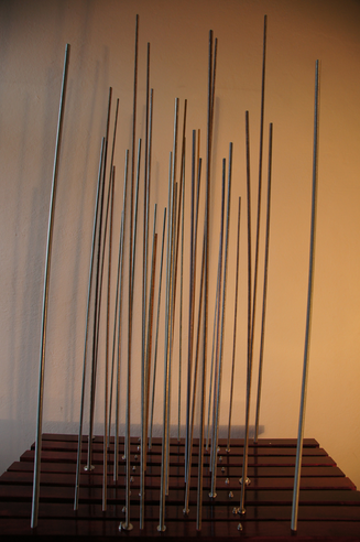THE WASHERS is an installation/instrument built with the proportions of the György Ligeti Hall in Graz, Austria where it also will be performed. The 33 threaded rods have a propotional distance as between the 33 speakers and the floor. So is also the distance between the rods propotional as between the speakers in the black box.The threaded rods are amplified and "played" with metal washers.