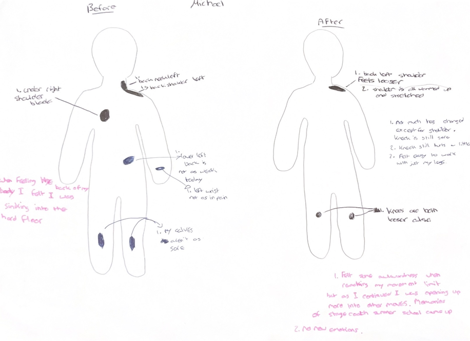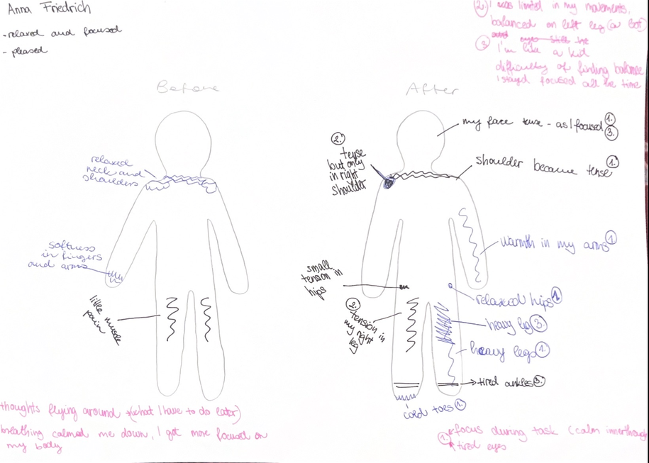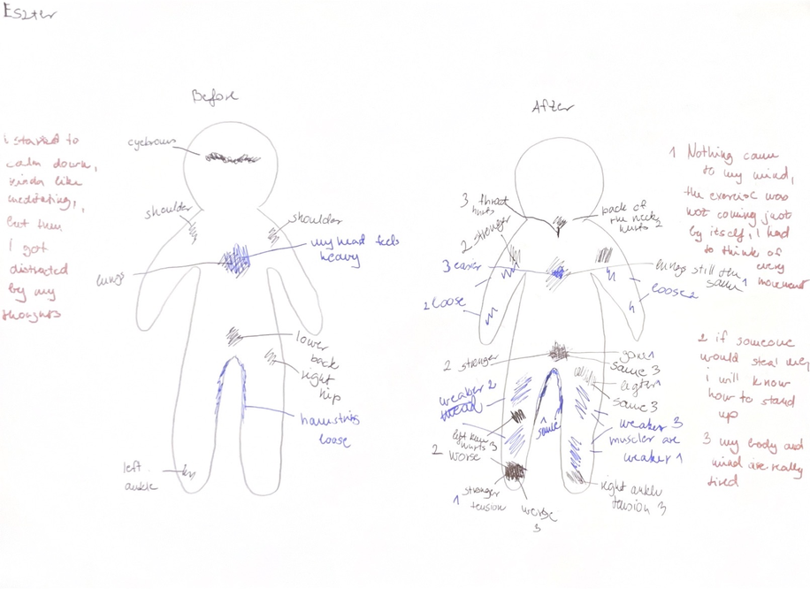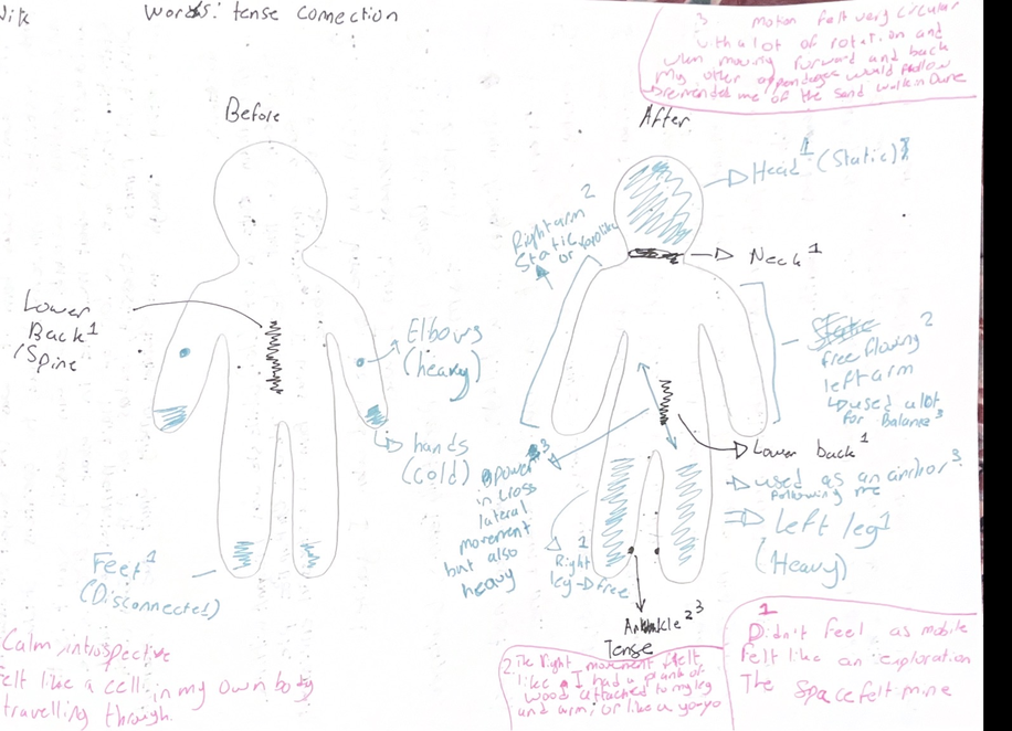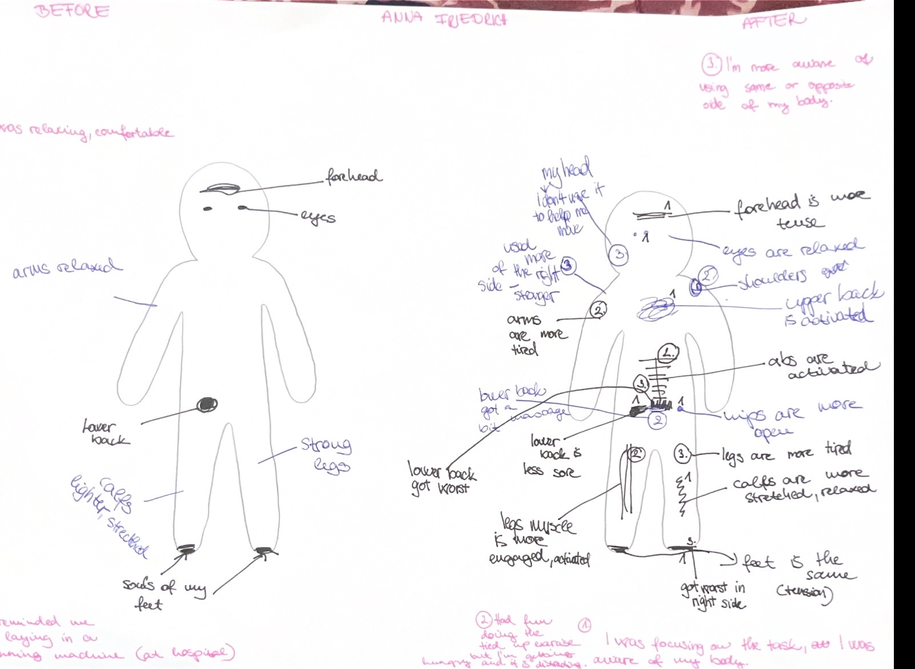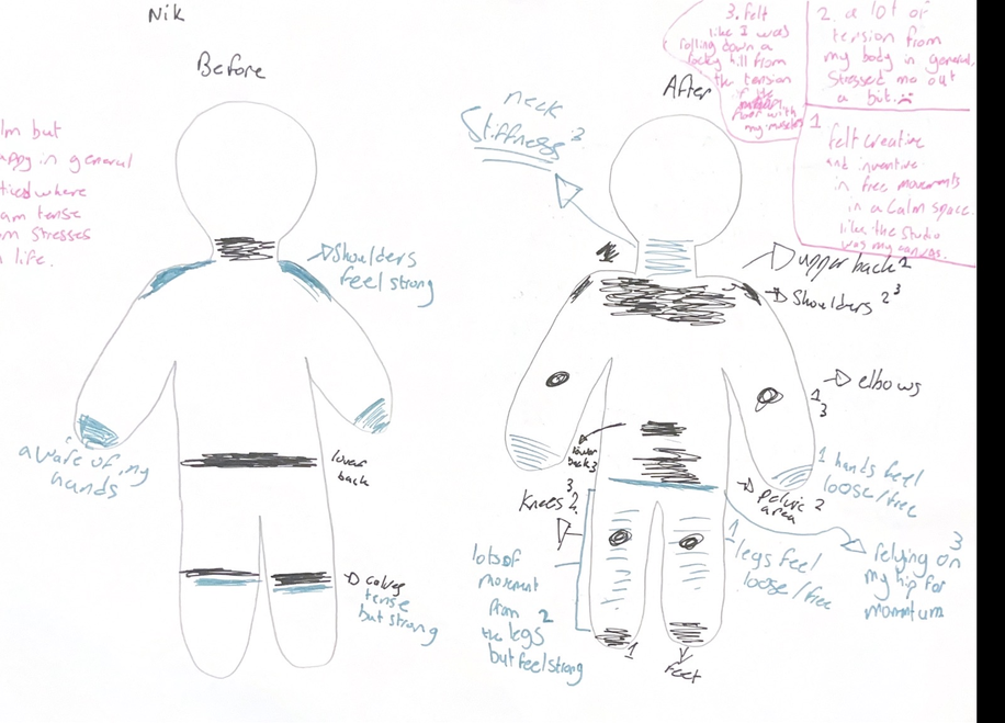 Each session integrated somatic body scanning, guided improvisation, restraint-based movement tasks, and reflective documentation through writing and body map diagrams. The repetition of structure supported participants in developing familiarity with the process, enabling shifts in awareness to emerge through experience rather than solely from instruction. All sessions were documented through video, along with all the reflective writing, as well as select observation notes written during and after the workshops, forming the basis for analysis presented here. It is important to note that all workshops were carried out in a dance studio, with the mirrors covered.
