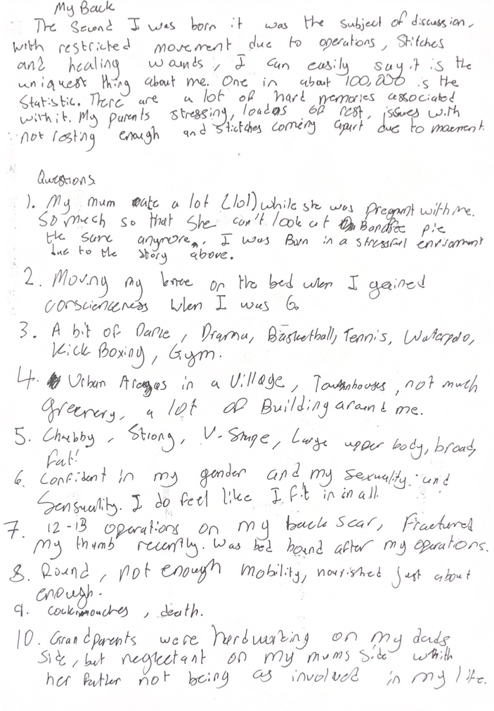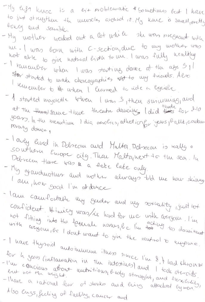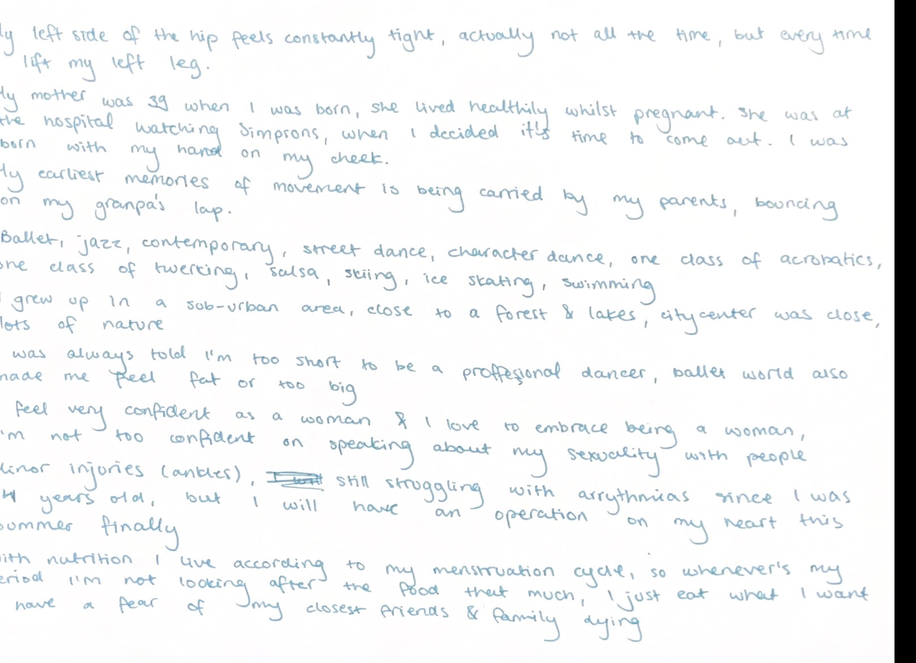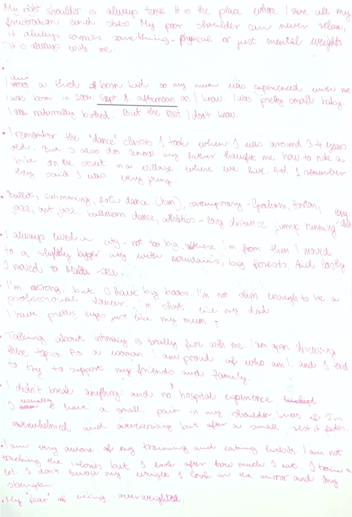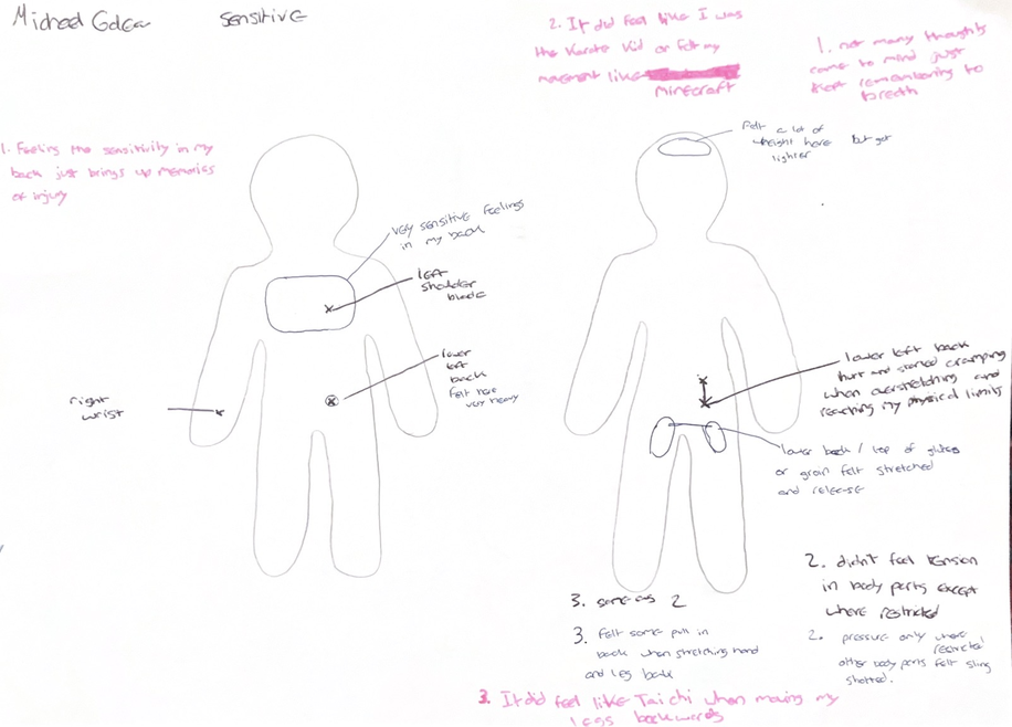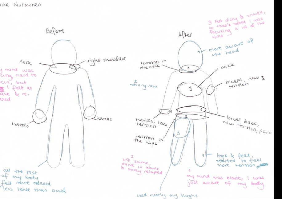 Each session integrated somatic body scanning, guided improvisation, restraint-based movement tasks, and reflective documentation through writing and body map diagrams. The repetition of structure supported participants in developing familiarity with the process, enabling shifts in awareness to emerge through experience rather than solely from instruction. All sessions were documented through video, along with all the reflective writing, as well as select observation notes written during and after the workshops, forming the basis for analysis presented here. It is important to note that all workshops were carried out in a dance studio, with the mirrors covered.