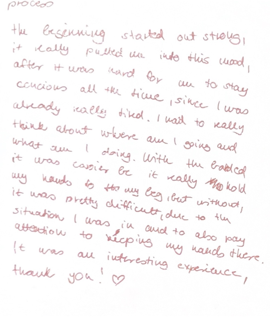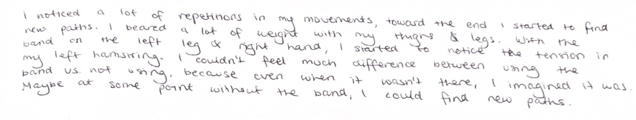 One of the most significant outcomes across both participant groups was the way that physical restraint heightened sensory awareness. The application of elastic resistance bands created a tangible sense of tension, effort, and constriction, directing the participants’ attention toward internal sensation over external form.