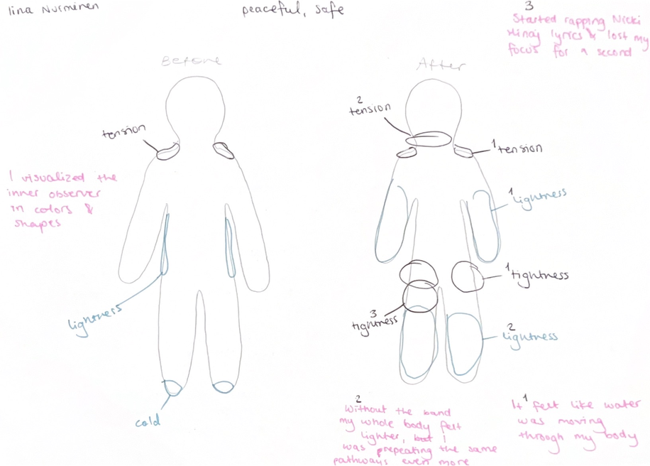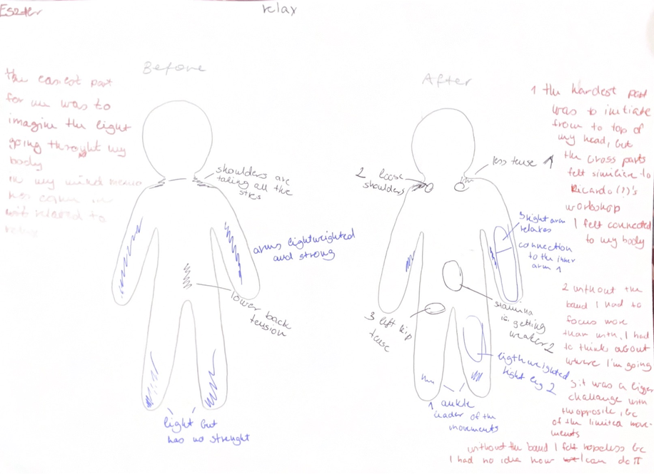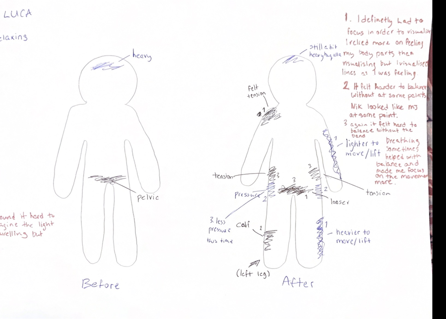 In the group featuring participants which are untrained in dance technique, this often revealed previously unnoticed areas of tension. Participants frequently marked sensations such as tightness, heaviness, and stiffness during the body-mapping exercises, expressing surprise at the intensity or location of these sensations, as well as how the sensation changed during the course of the workshops. The restraints thus functioned as a revealing mechanism, making the individual body patterns perceptible, which had not been consciously recognised prior to these workshops.