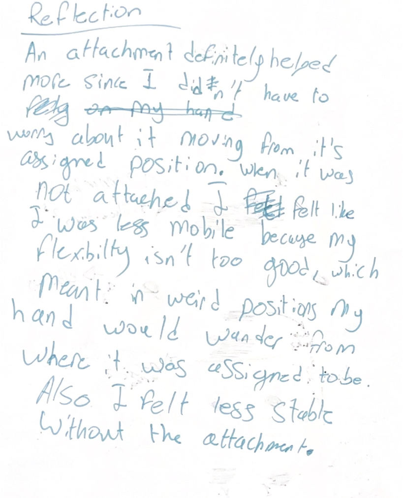 In contrast to this, participants with technical dance training tended to demonstrate an existing attentional focus toward internal sensation. Their reflections indicated a more immediate awareness of bodily organisation and effort, suggesting that prior training had cultivated sensitivity to internal feedback. However, the restraint still managed to shift their awareness, by disrupting familiar movement habits, and requiring informed adaptation.