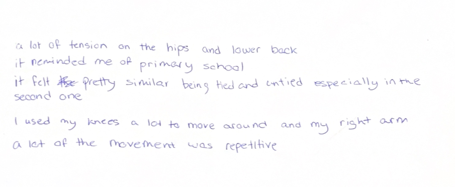 Interestingly, both participant groups demonstrated a similar capacity to recall and reproduce movement pathways after the restraints were removed, and both seemed to move to specific points of recreation, in a different order to their original restrained explorations. This challenged an initial assumption that technical training would result in a largely greater accuracy or retention. Instead, the task highlighted how embodied memory operates through sensation and pathway rather than through technical precision alone.
