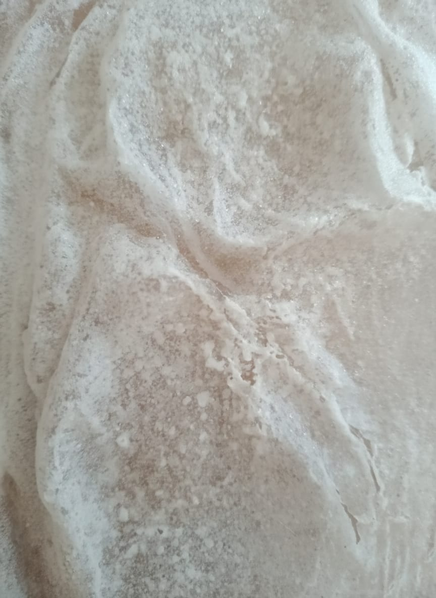 2.2 Amuchina as a Temporal Accelerator (Controlled Oxidation) The hypochlorite acts upon mineral pigments (particularly earths and oxides), accelerating the aging process. Pigment Blooming: The reagent triggers an instantaneous “blooming,” revealing veins and textures that in nature would require years of exposure to the elements. Reaction Control: The research focuses on calibrating the quantity of the reagent to achieve a “controlled collapse” of the form without destroying the fibrous substrate.