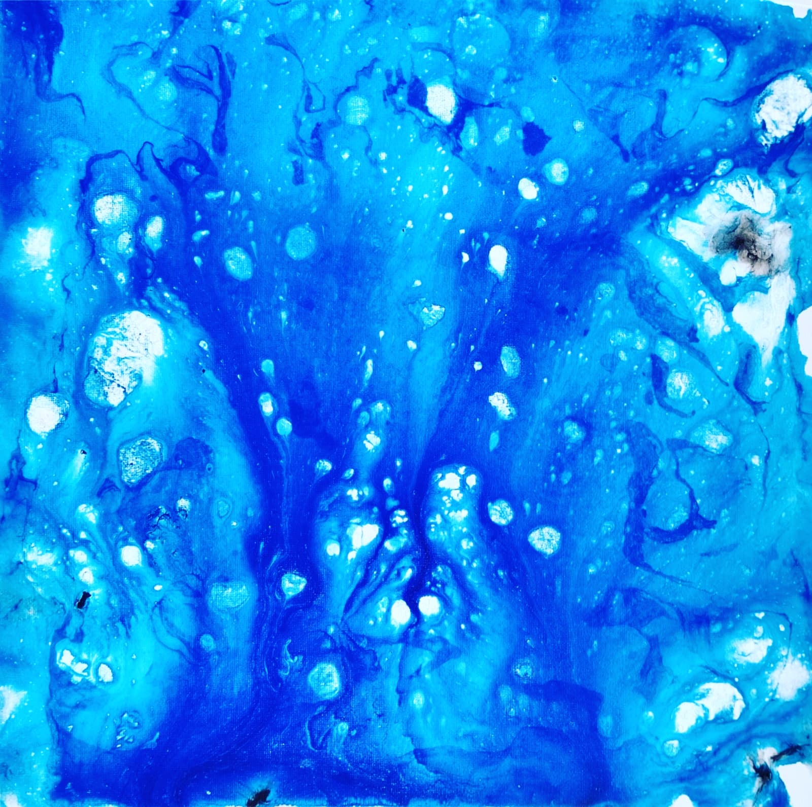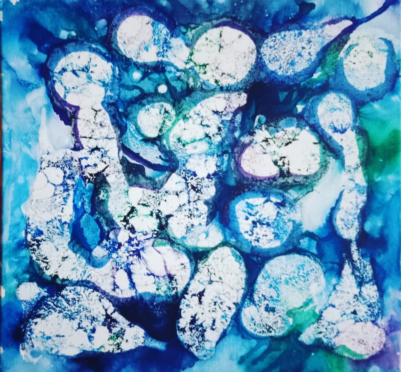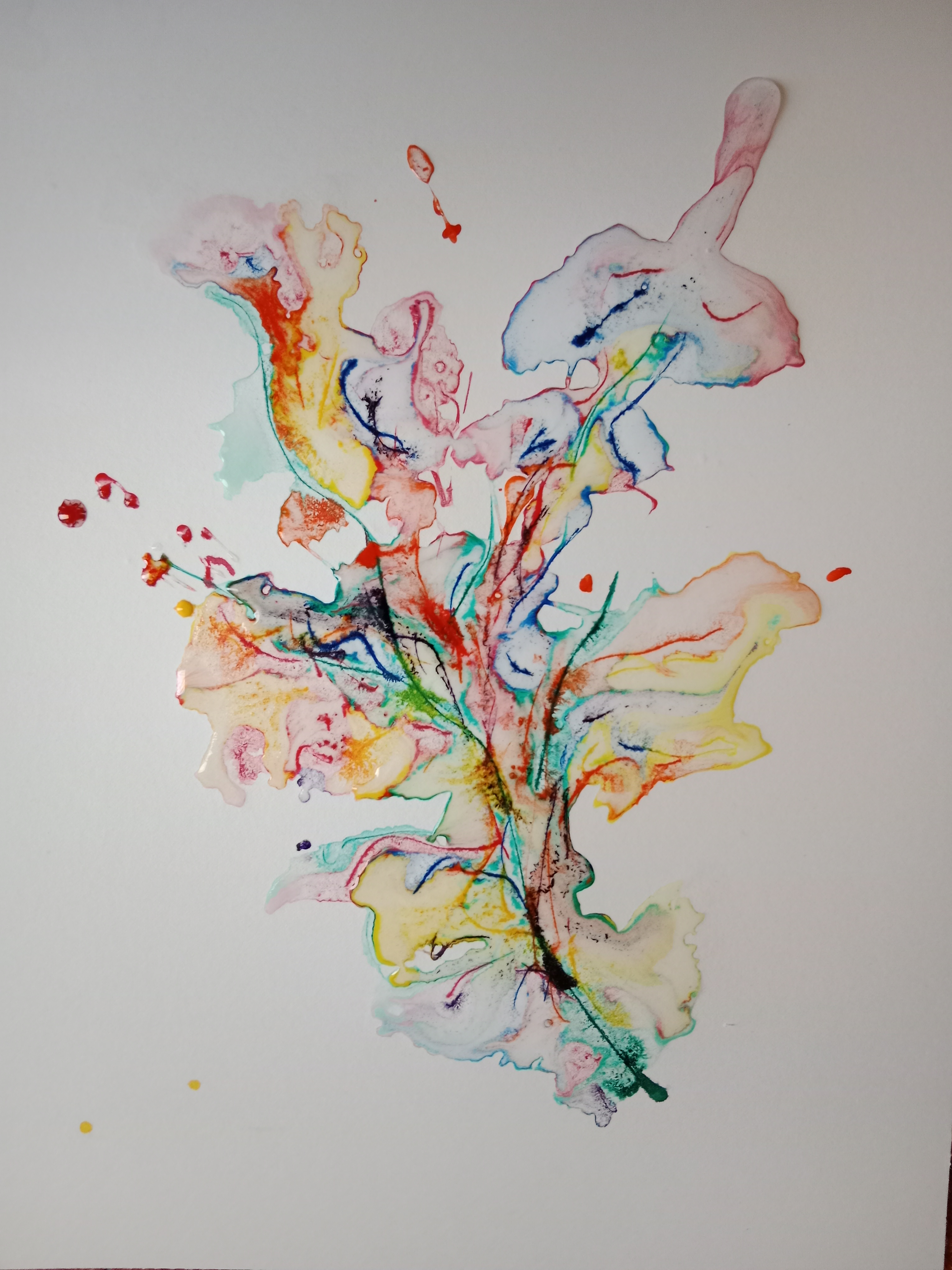 “Risvolti Neuro-Estetici” Chromatic Autonomy and Organic “Blooming” through Sodium Hypochlorite. This work illustrates the “Separation Protocol” described in the research. The reagent prevents the uncontrolled mixing of pigments, allowing for the emergence of autonomous floral structures. The dendritic patterns and vibrant, non-contaminated colors demonstrate the transition from traditional ‘mixture’ to a ‘molecular structure’ directed by the artist’s divergent gaze.