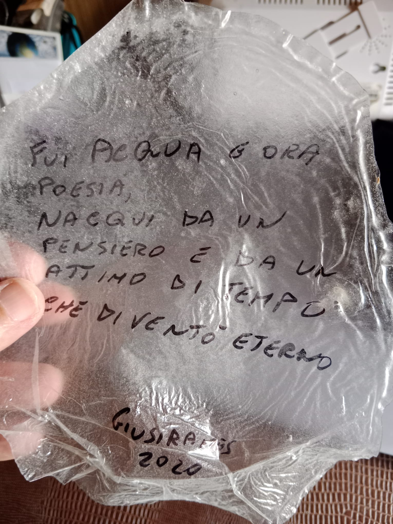 The Crystalline Memory - Solidification of Fluid Matter. A tangible demonstration of the “Hydro-stratification” protocol. This image shows a thin, transparent membrane of solidified fluid, held as a permanent sculptural artifact. The surface texture, resembling a biological or cellular network, illustrates the stabilization of a previously liquid state. This sample embodies the “Ethics of the Return”: a moment of stabilized poetry that remains chemically inert, fire-retardant, and ready to dissolve back into its original element if exposed to the cycle of humidity.