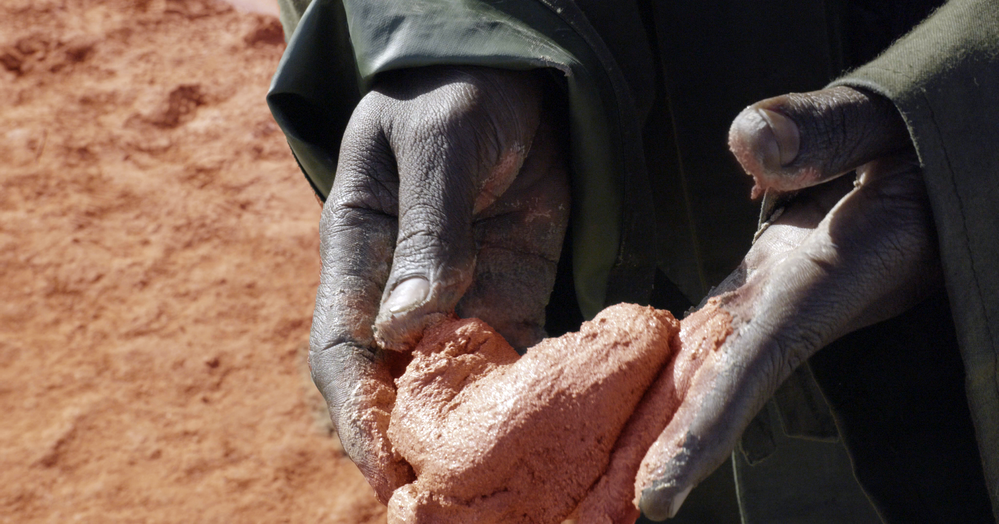 Still image of bauxite soil and vegetation viewed from a car window near Milk River, Jamaica, 2023. Photo credits: Whyte&Zettergren.