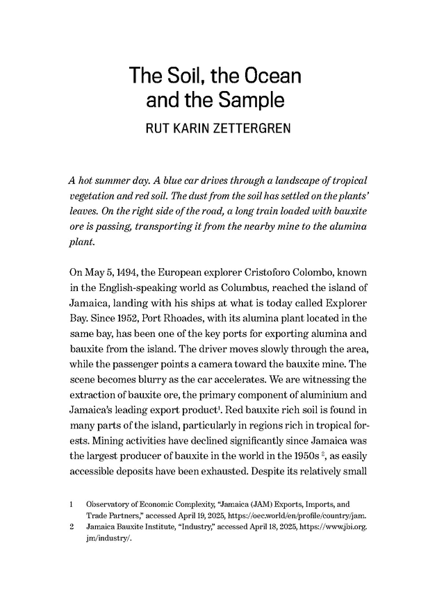 The essay The Soil, the Ocean and the Sample by Rut Karin Zettergren includes scene descriptions and reflections from research trips to Jamaica and Iceland undertaken as preparatory studies for The Contingency Sample. Published in May 2025 in Unfolding Island Ecologies, a book that brings together essays by artists, curators, and researchers examining ecological interdependence, extractivism, and artistic practices.