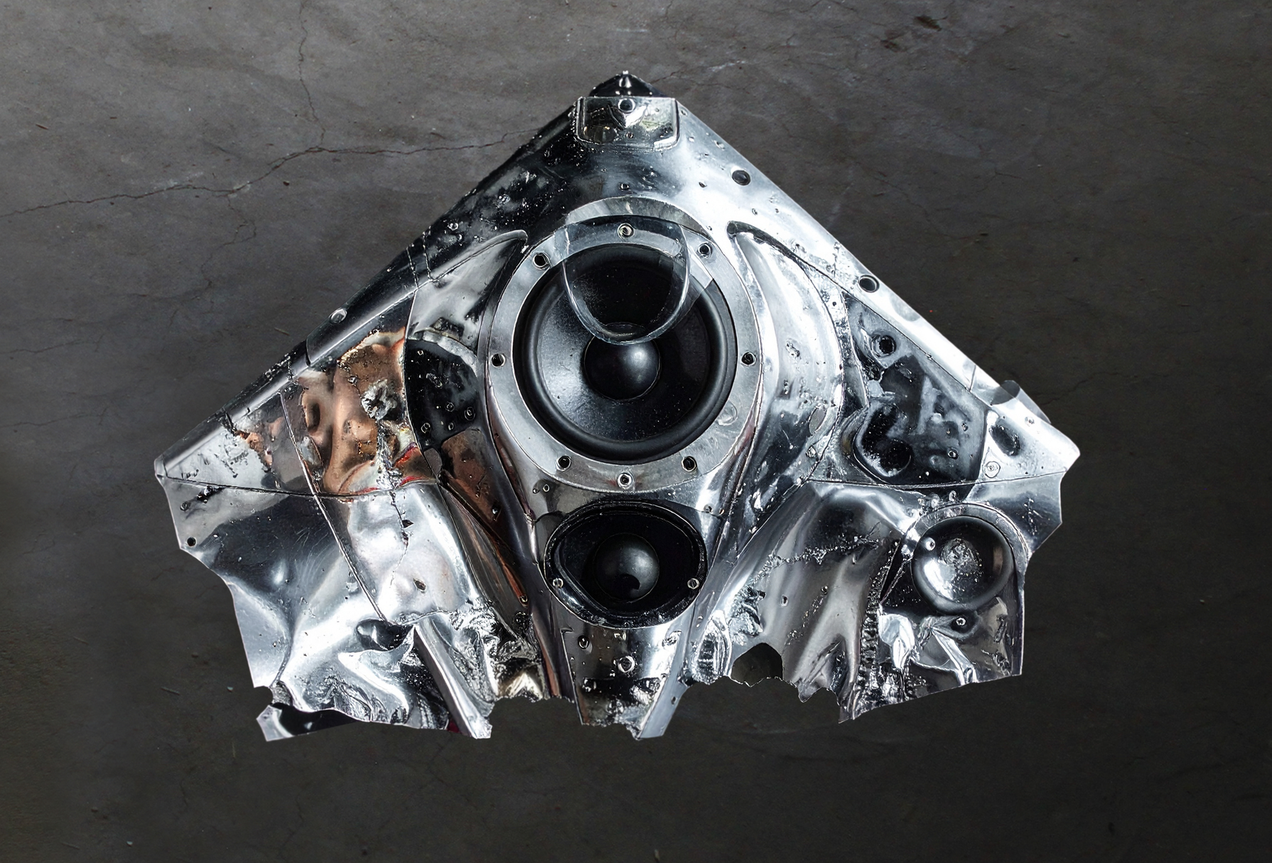 The finished work will be presented as an installation combining the aluminium sculptures, homemade speakers, and the video, shown alongside other pieces from the larger project. The sketches for the installation are photoshopped images from earlier works, images of Verksmiðjan Hjalteyri, and aluminium objects created with the help of Whyte&Zettergrens hand sketches and visualised by AI.