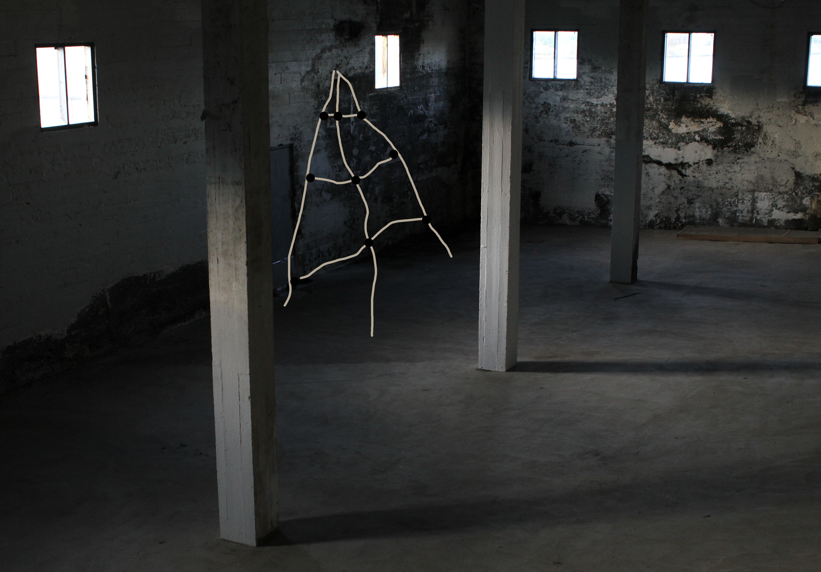 The second work reflects on the interconnection of Greenland, Iceland, and Jamaica through the aluminum industry and transatlantic shipping. Rope ladders, recalling those once used on ships, are suspended in the space. Rendered as abstract, drifting forms, they evoke webs of time and history rather than serving a practical function.