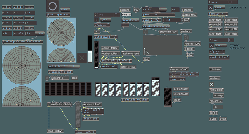 The sounds in this part of the composition were made in a Max/MSP patch. The sound sources were created using algorithmic reverb – Mitchell Turner’s rev3~ extension. These sources moved through an ambisonic virtual spherical space. The positions of these sources were then encoded and decoded for eight channels using ICST Ambisonic Tools. In this section, the main goal was to avoid the presence of a sweet spot.