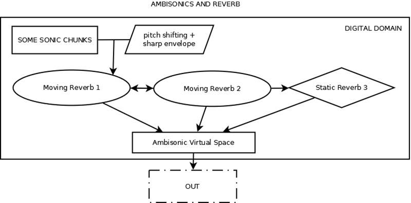 Changing the virtual position of the reverb caused feedback in the virtual space before encoding (see fig. 1). This feedback added tension and a certain level of unpredictability to the sound events. Also, these relations between reverbs were adjusted algorithmically by changing the elevation and the distance from the hypothetical sweet spot and the azimuth, which produced the movement between the loudspeakers.
