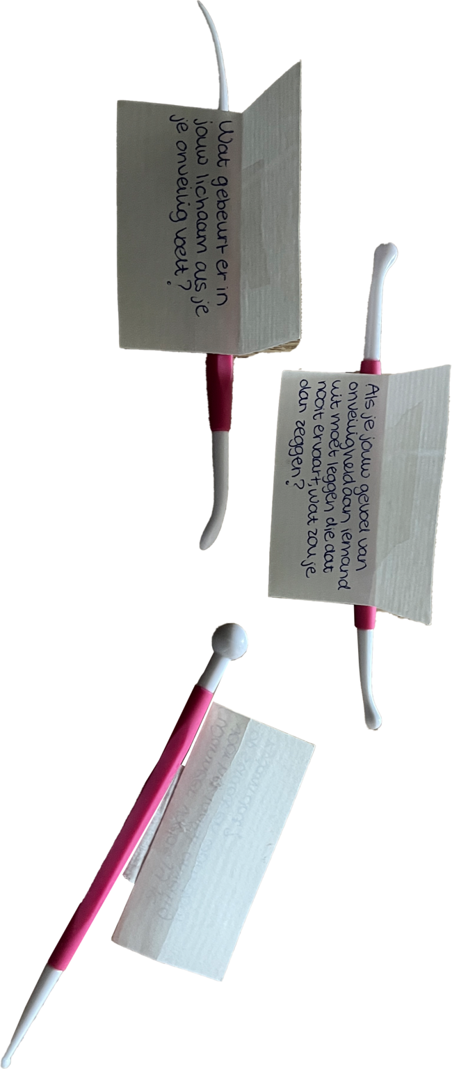 Een workshop ontworpen om mensen een object kleien te laten kleien die symbool staat voor hun gevoel van veiligheid op straat. Aan de kleimaterialen hingen vragen die ze om de beurt beantwoordden en het gesprek op gang brachten. Zo ontstond er een kwetsbaar gesprek tijdens het kleien.