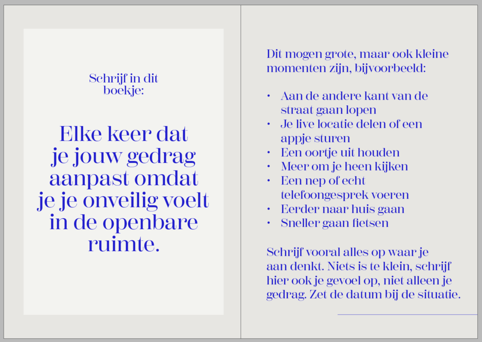Een ontworpen onderzoekstool om de onzichtbare ervaringen zichtbaar te maken. Mannen en vrouwen hielden voor twee weken bij wanneer ze hun gedrag aanpasten omdat ze zich onveilig voelde in de openbare ruimte.