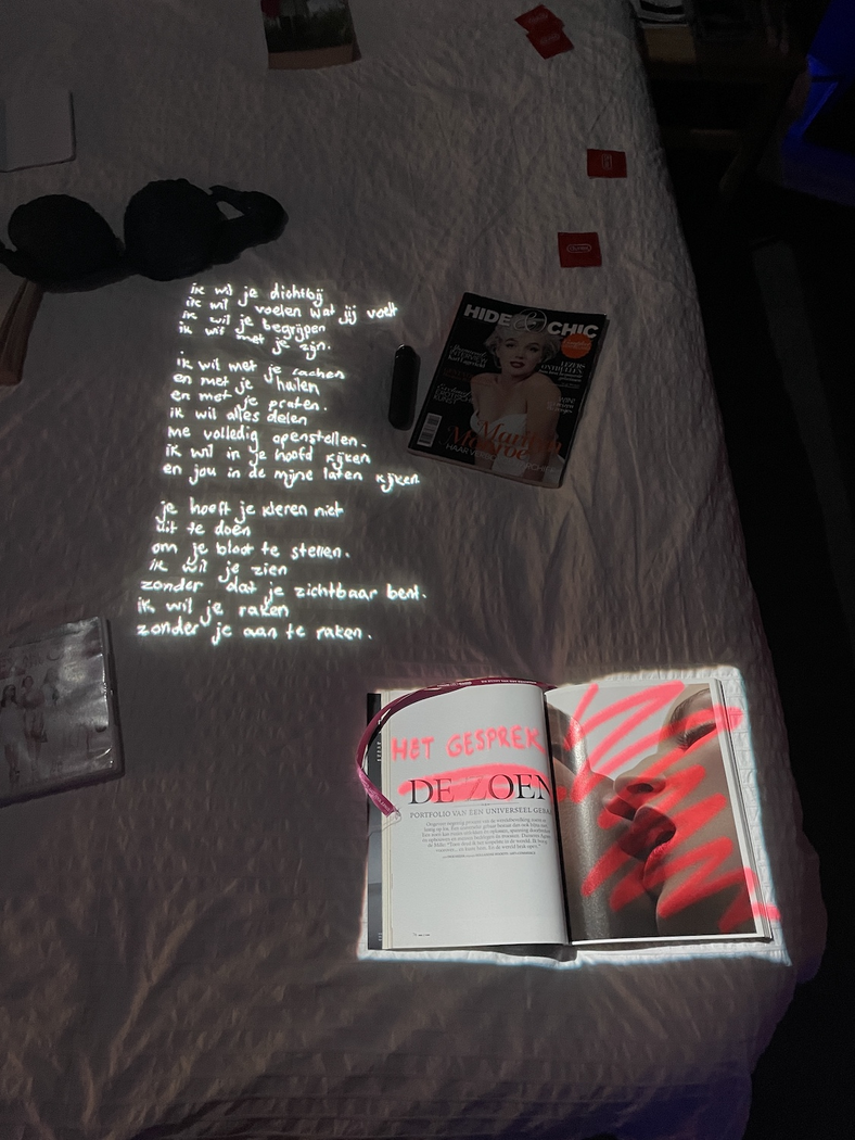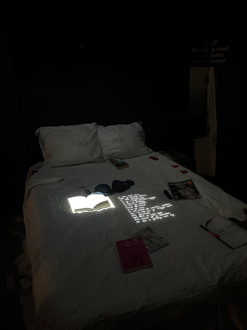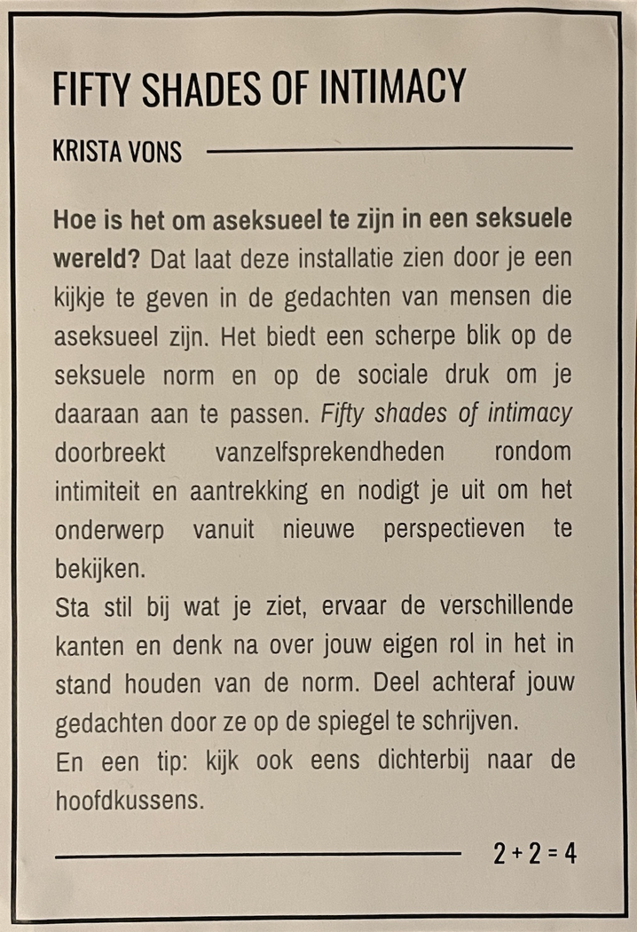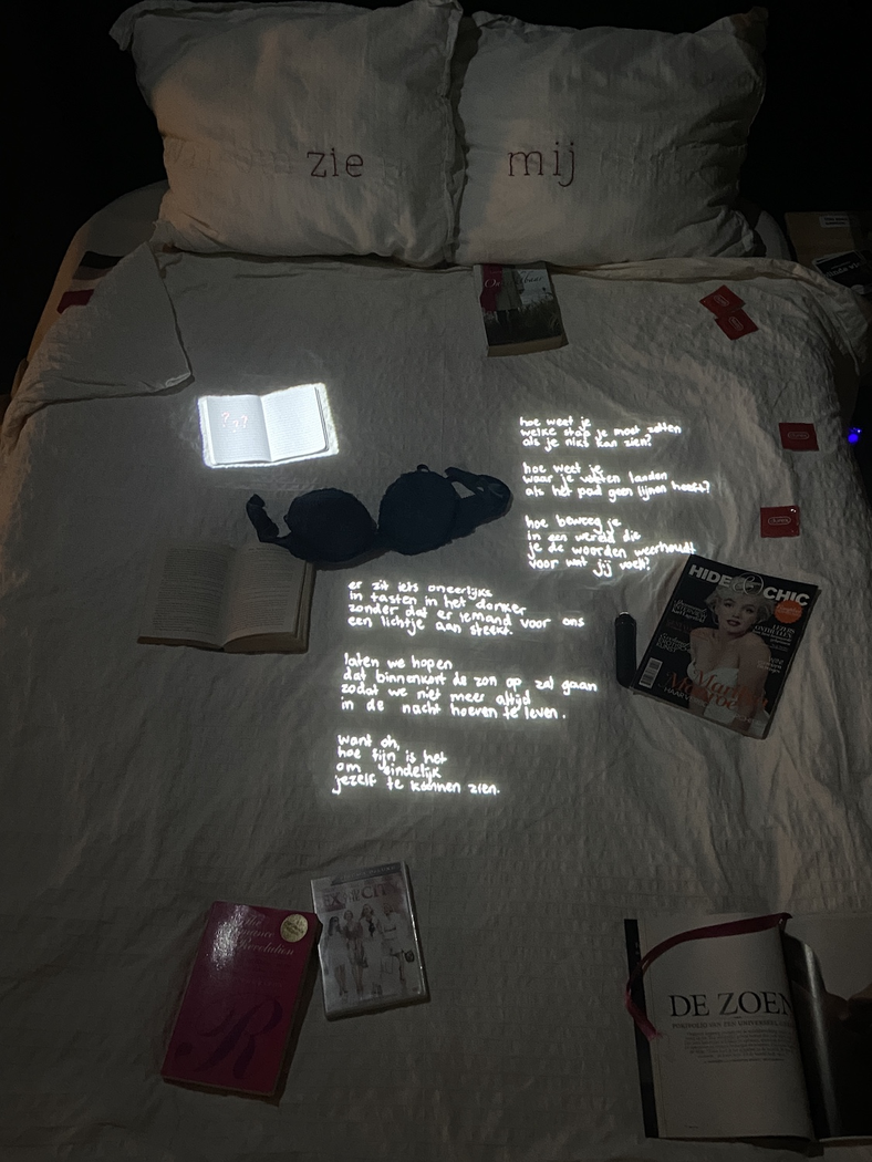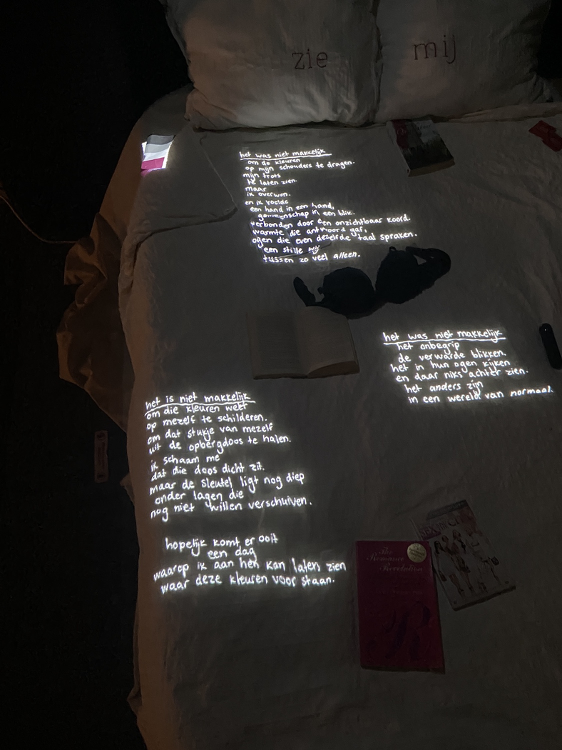 Expositie werk over de seksuele wereld v.s. de aseksuele wereld. Op het bed lagen objecten, waar gedichten naast geprojecteerd werden met een beamer. De gedichten gaan over hoe het is om aseksueel te zijn. In het rood werden ook nog kleine notities geschreven, kritiek of gedachtes over hoe seksueel de maatschappij is.