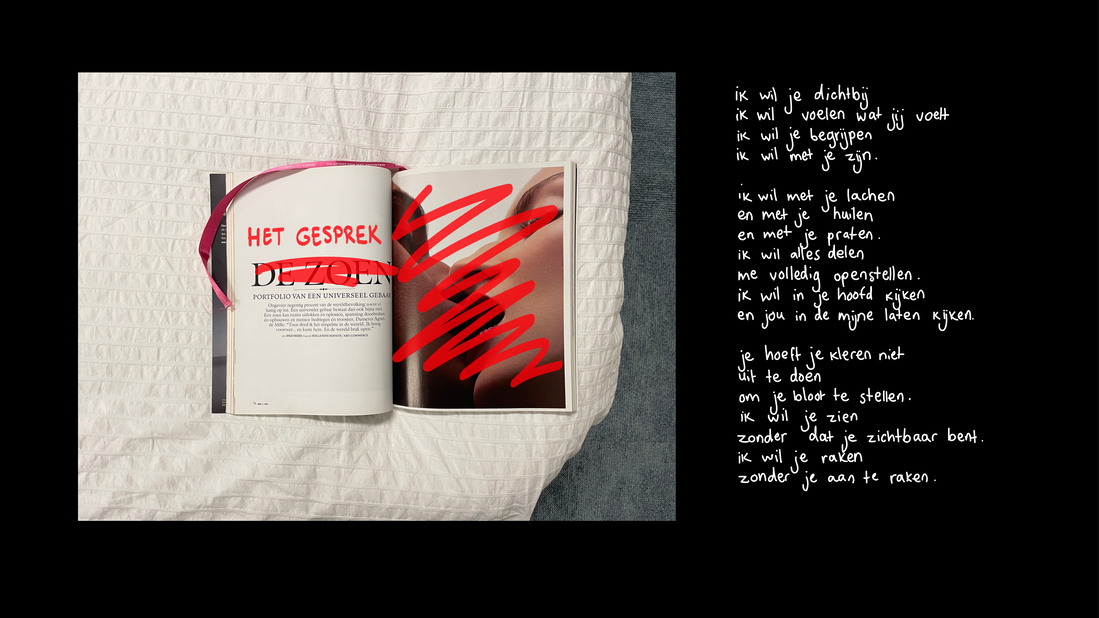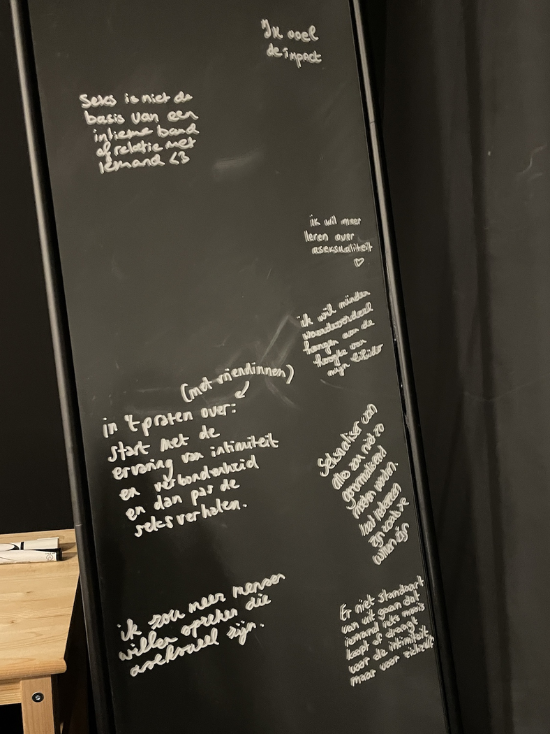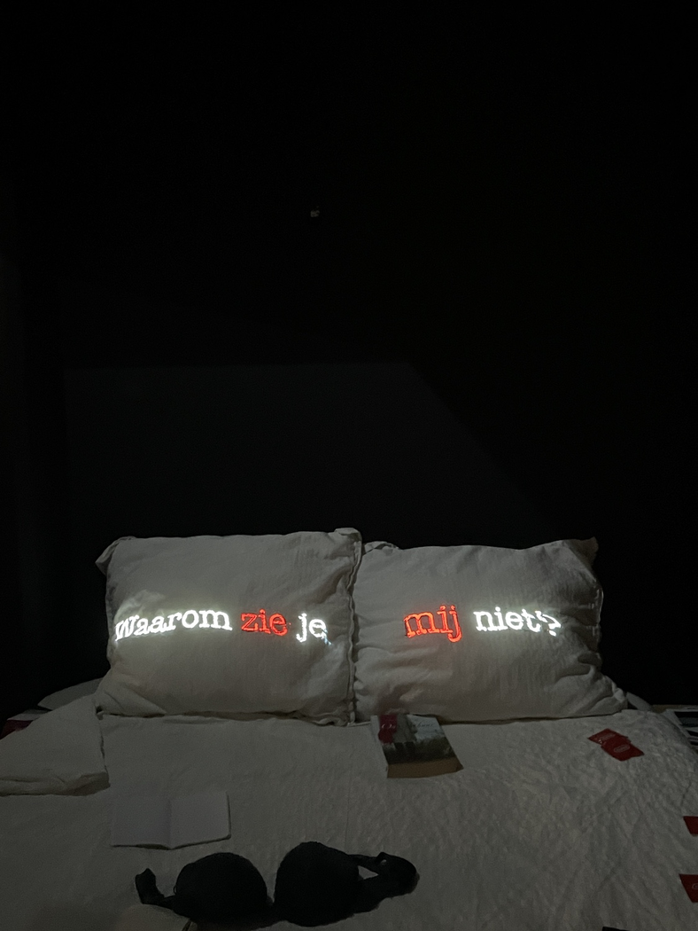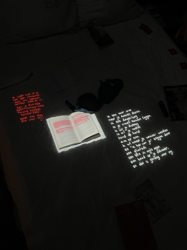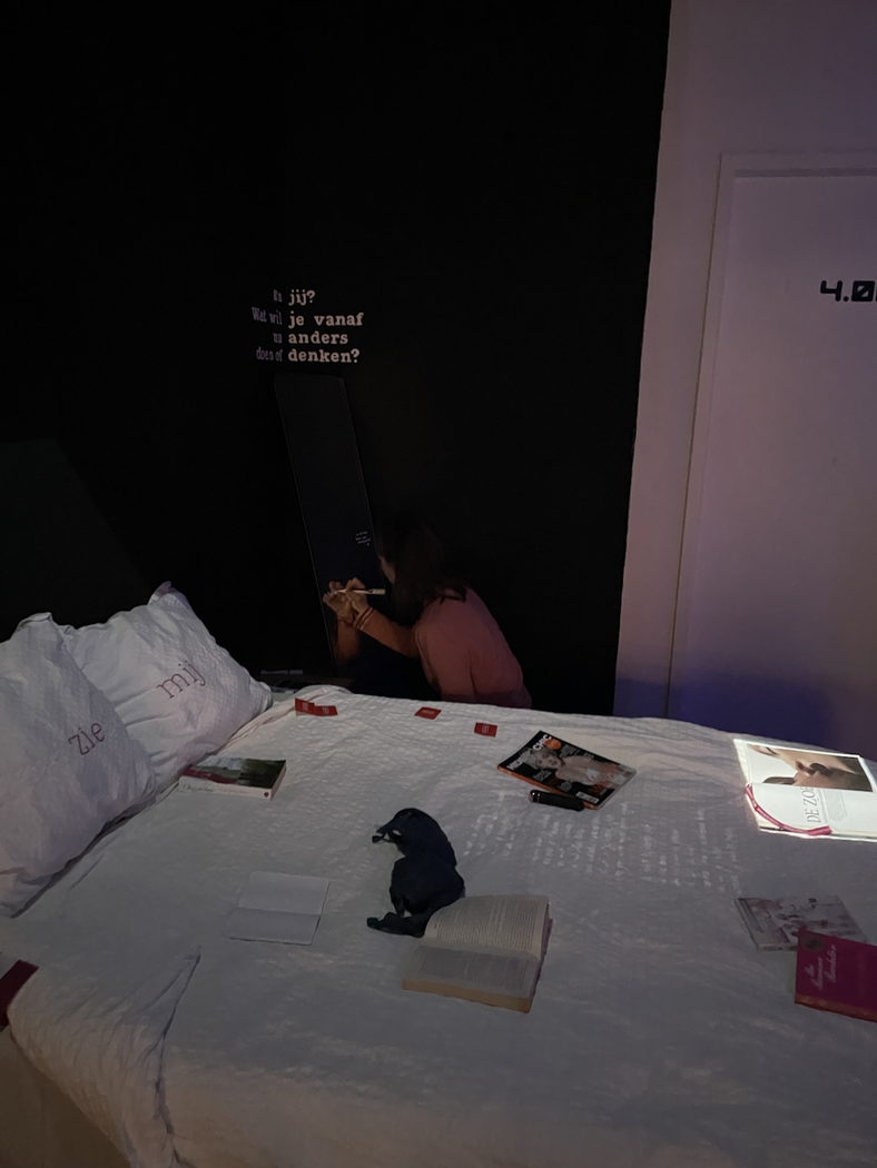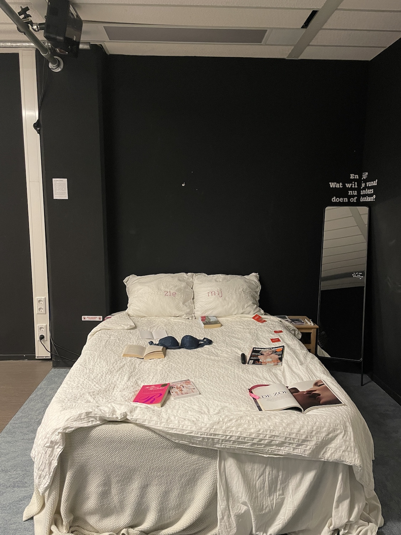 Expositie werk over de seksuele wereld v.s. de aseksuele wereld. Op het bed lagen objecten, waar gedichten naast geprojecteerd werden met een beamer. De gedichten gaan over hoe het is om aseksueel te zijn. In het rood werden ook nog kleine notities geschreven, kritiek of gedachtes over hoe seksueel de maatschappij is.