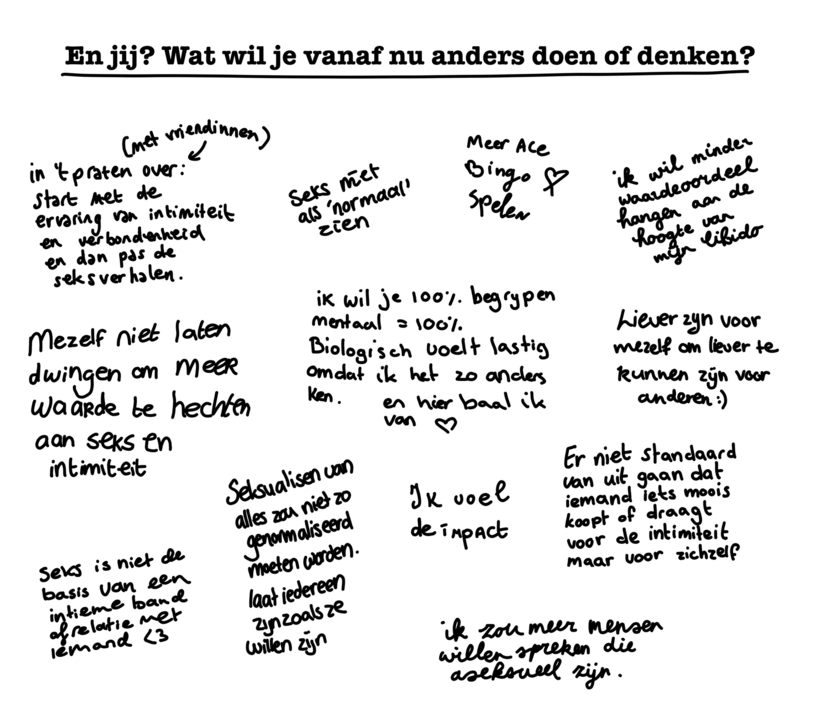 Zo werd duidelijk dat er onder bijna iedereen, zelfs binnen de lhbtiq+ community, relatief weinig kennis is over aseksualiteit. Daardoor zijn er misvattingen in de zorg, is er weinig voorlichting over, en ervaren aseksuele mensen allerlei problemen. De moeilijkheden die aseksuele mensen ervaren worden versterkt door de samenleving waarin een sterke seksuele norm heerst, mede beïnvloed door mannencultuur. Opvallend is dat ook veel niet-aseksuele mensen deze norm als beperkend ervaren.