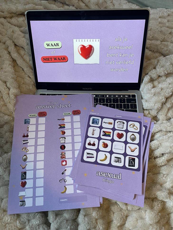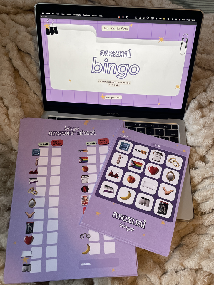 Om meer te leren over wat alloseksuele mensen weten over aseksualiteit, en wat voor (voor)oordelen zij hebben, heb ik deze spelletjes ontworpen als quiz en gesprekstool. Dit is de ace bingo: een bingo met waar/niet waar vragen over aseksualiteit.