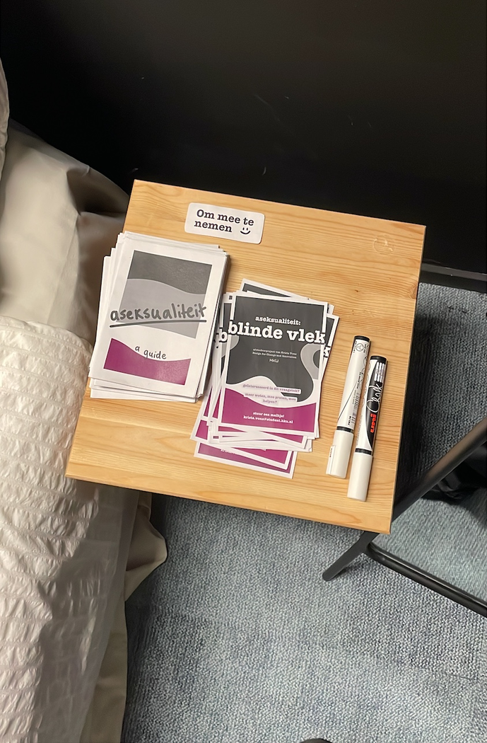 Daarom richt ik me in de ontwerpfase van het project op het zichtbaar maken van aseksualiteit. Omdat aseksualiteit door iedereen anders wordt ervaren, wil ik zorgen dat ik een veelzijdig beeld van aseksualiteit neer zet. Daarmee wil ik meer aannames en misvattingen voorkomen. Dit alles wil ik doen in samenwerking met zowel aseksuele als niet-aseksuele mensen, en professionals.