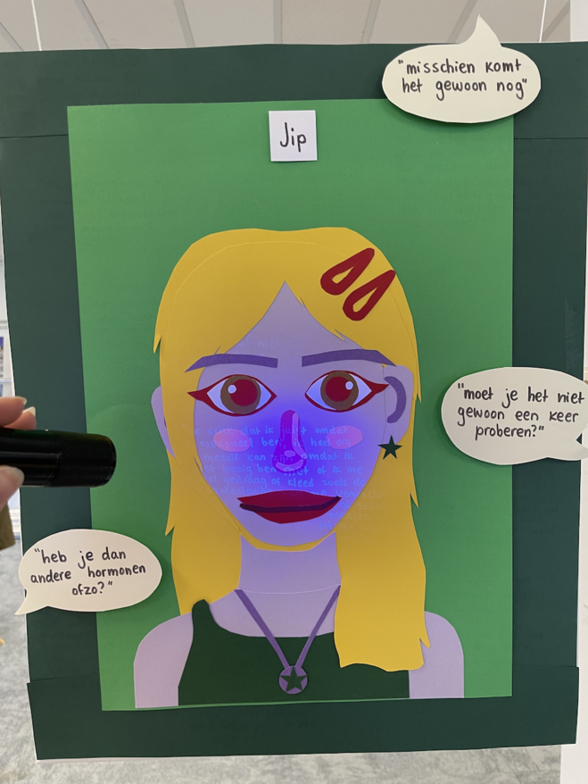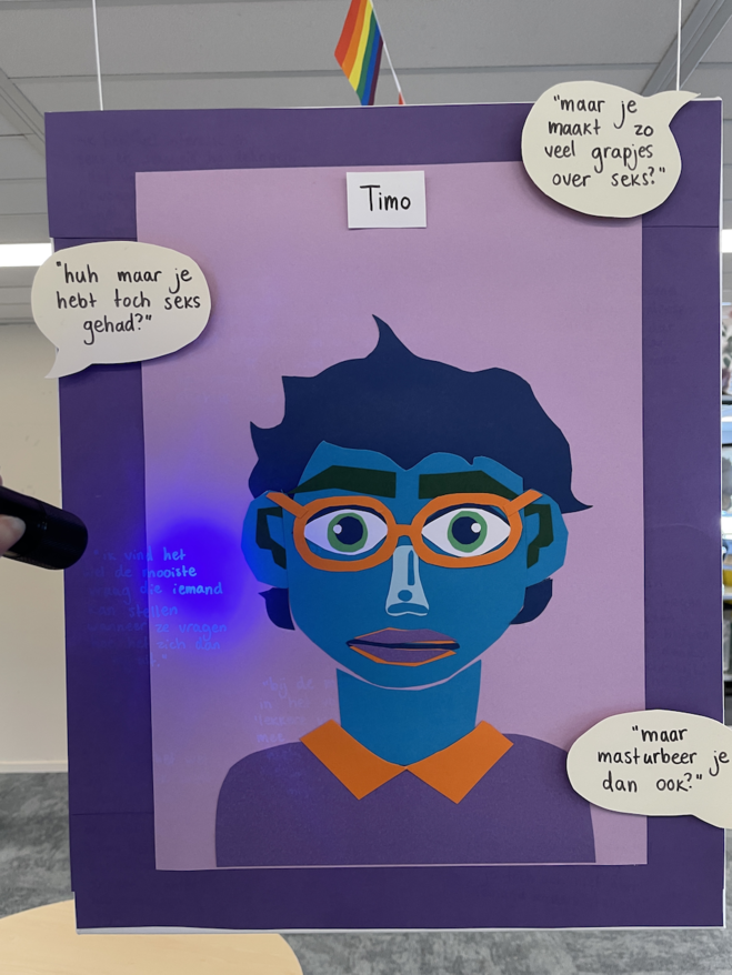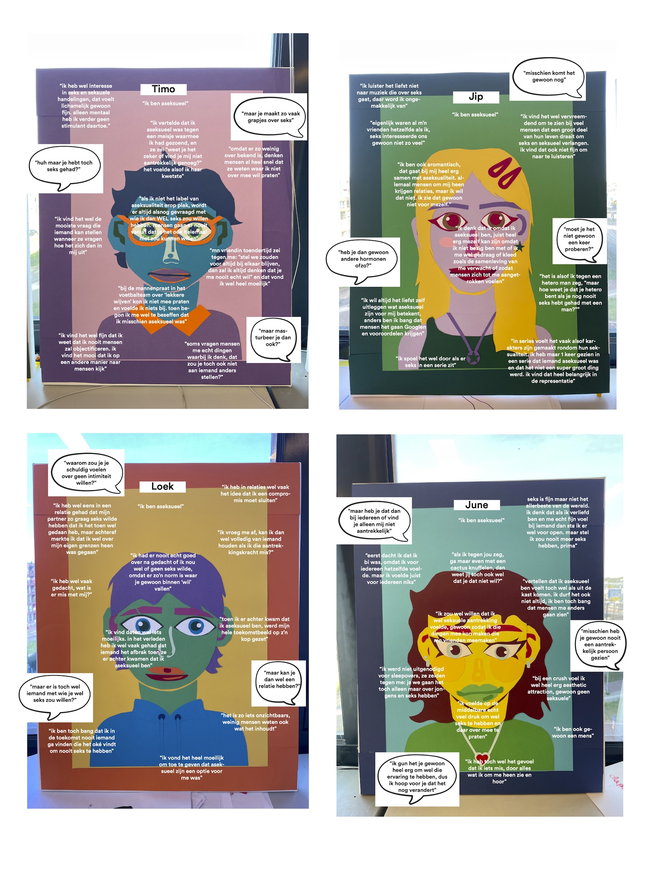 Een werk voor een expositie waarbij we de urgentie van ons vraagstuk moesten overbrengen. Het zijn portretten van (fictieve) aseksuele personen, met uitspraken er omheen die aseksuele mensen te horen krijgen. Daaronder, op de portretten zelf, staat in onzichtbare inkt per persoon hun eigen verhaal geschreven. Door met een UV zaklamp over de portretten te gaan werd de onzichtbare inkt zichtbaar. De verhalen bestaan uit losse quotes die ik had gehoord in mijn gesprekken met aseksuele mensen. Die quotes zijn soms grappig, schokkend, zelfs zorgwekkend.Met het werk wilde ik benadrukken dat elke persoon weer anders is en andere dingen ervaart, en dat juist daardoor de vooroordelen zo gevaarlijk maar ook verklaarbaar zijn.